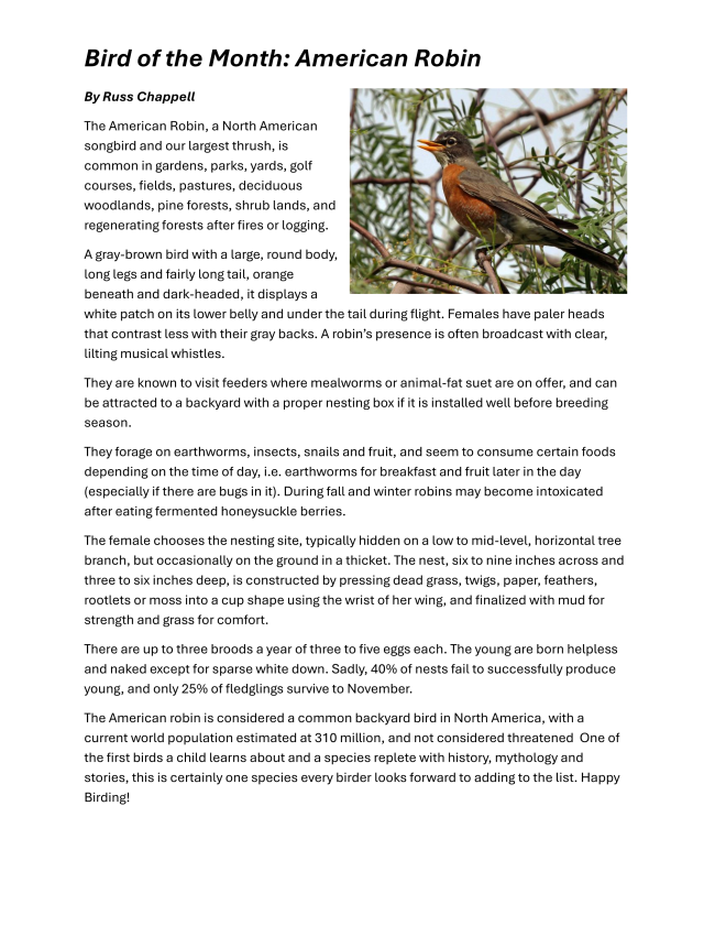 All the board members share all the tasks for steering this little ship, and we owe them a big debt of gratitude. But it take more than the officers. If you are organized, an artist, a media or IT person, a retired attorney, a bird-lover, a writer--- You get the idea --we welcome your help and we are always happy to meet new members, so don't be shy!